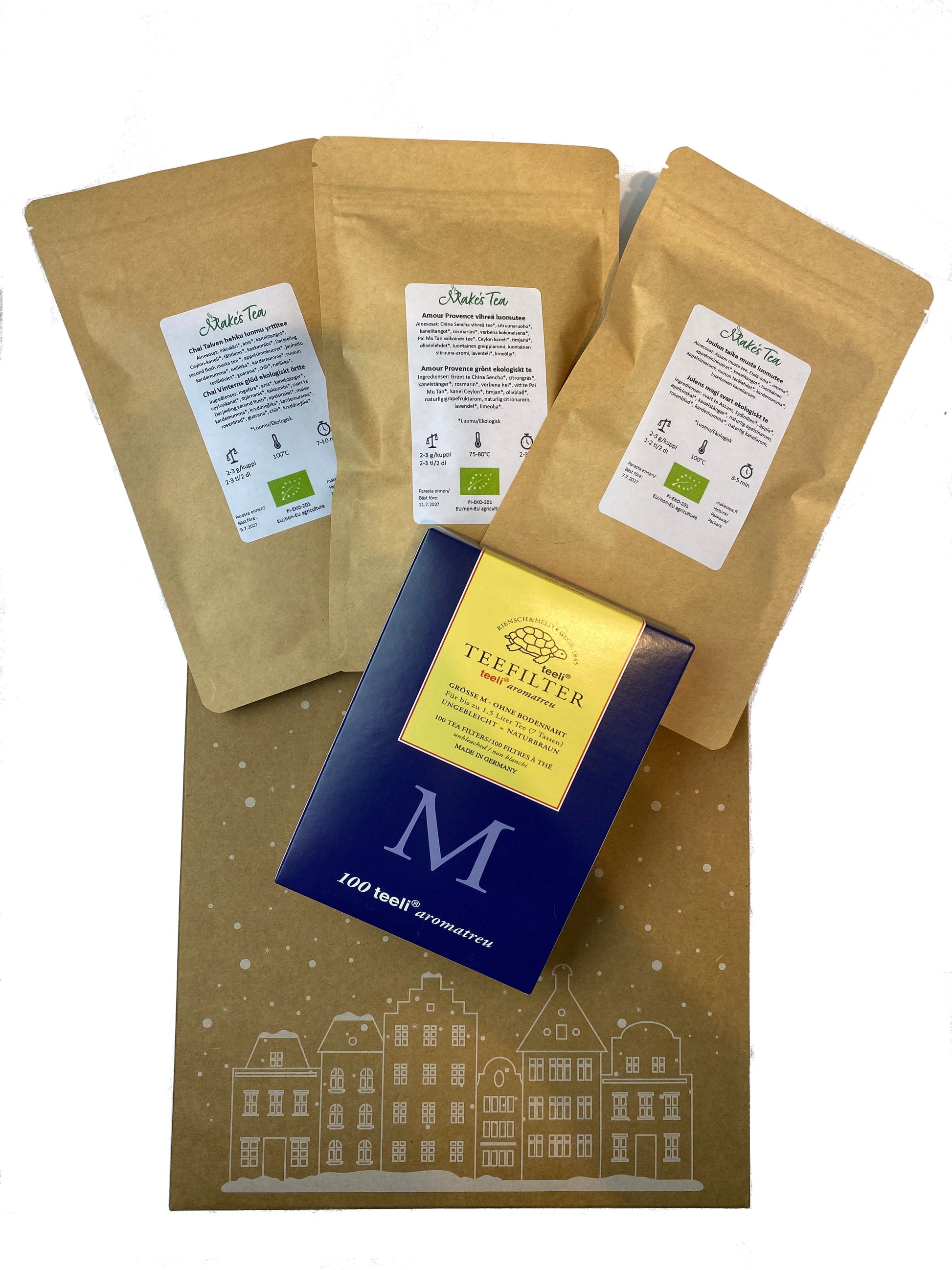 Sydäntalven Makuhetket -lahjapakkaus kokoaa yhteen kolme erilaista luomuteetä, jotka täydentävät toisiaan ja tuovat lämpöä, pehmeyttä ja ripauksen juhlan tuntua talven hetkiin. Mukana tulee myös kätevät kertakäyttöiset haudutuspussit, joiden avulla teen nauttiminen on helppoa missä tahansa. Jokainen teepussi sisältää 50g irtoteetä.